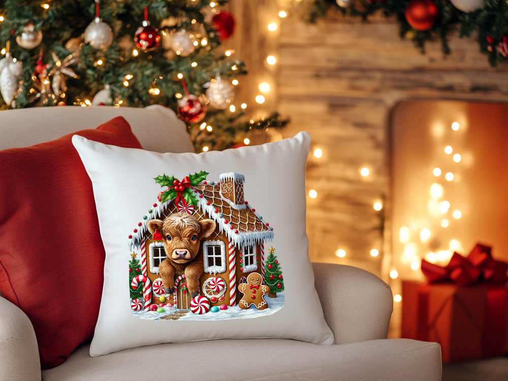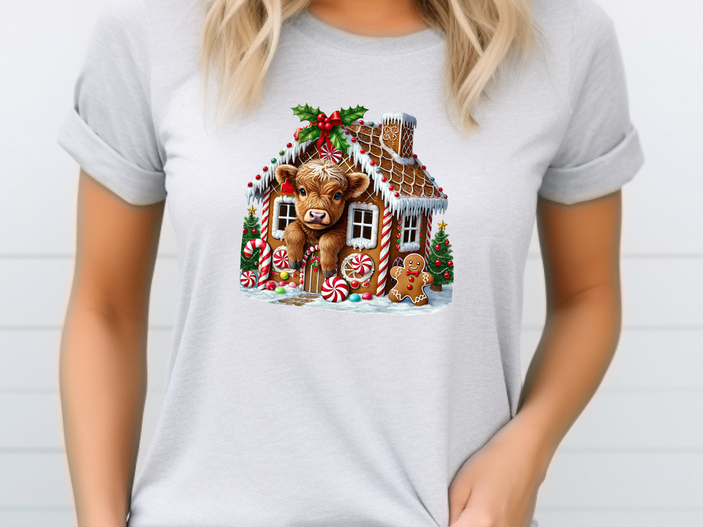 This Christmas DTF transfer features an adorable Highland cow nestled in a gingerbread house, perfect for festive DIY holiday apparel. Add a cozy, whimsical touch to Christmas T-shirts and crafts with this unique, ready-to-press design.