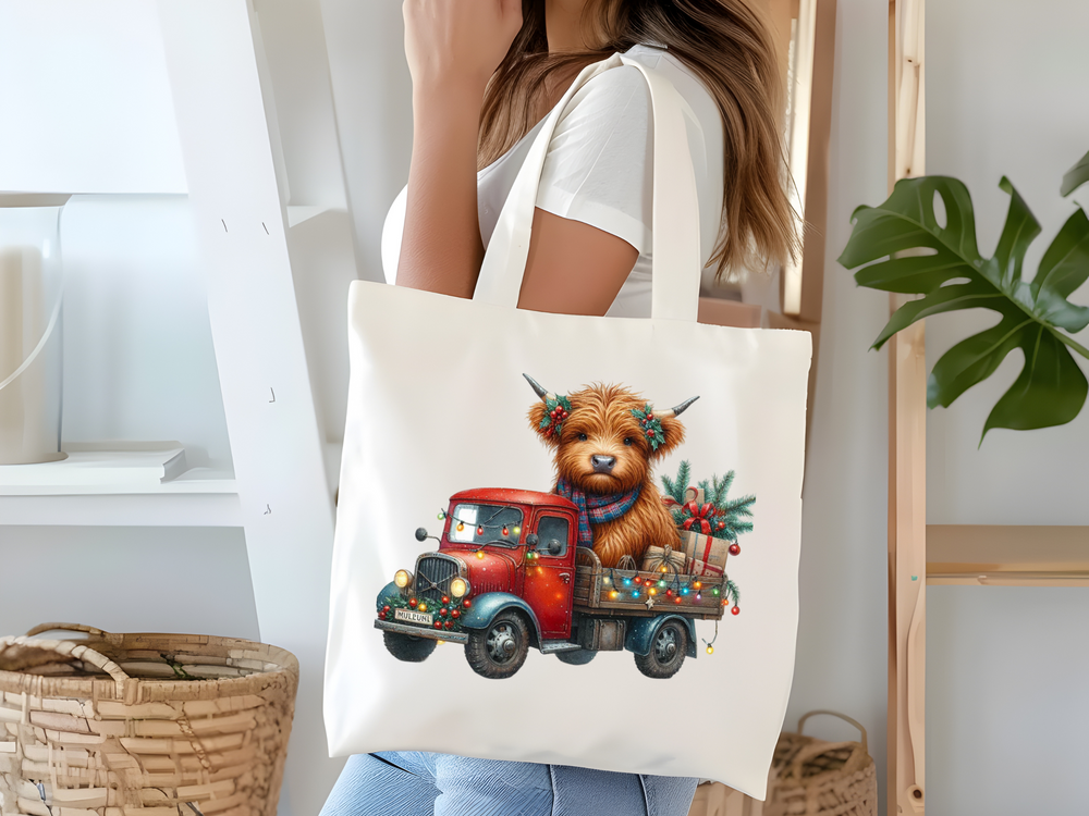 The Christmas Highland Cow PNG features a vintage Christmas tree truck clipart, perfect for festive designs. Ideal for sublimation projects or Heifer cow Christmas DTF transfers, this design adds a charming holiday touch to custom apparel and crafts.