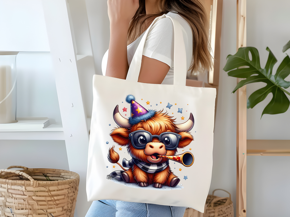 Celebrate the New Year with this charming Highland Cow DTF Transfer featuring a festive party cow. Perfect for creating DIY Happy New Year T-shirts, this ready-to-press design adds a unique touch to your holiday apparel projects.