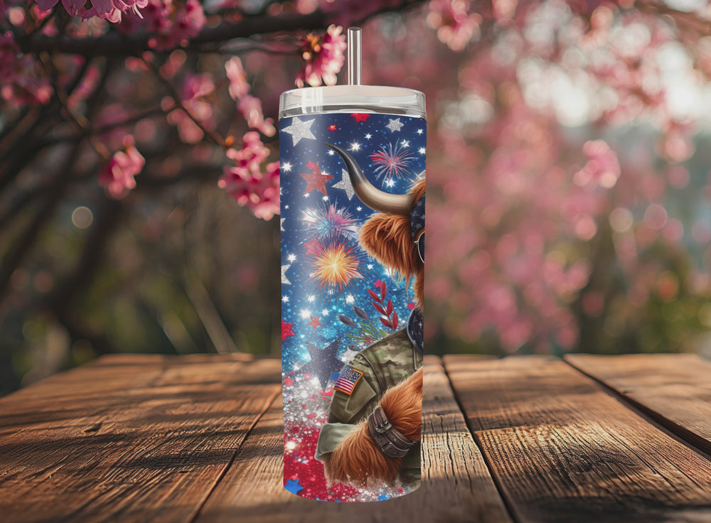 Celebrate Independence Day with a touch of humor and style with our 4th of July Funny Highland Cow 20oz Skinny Tumbler! Featuring a red, white, and blue patriotic cow design, this tumbler wrap is perfect for showing off your patriotic spirit. The military-inspired elements add a unique twist, making it a standout piece for any celebration.