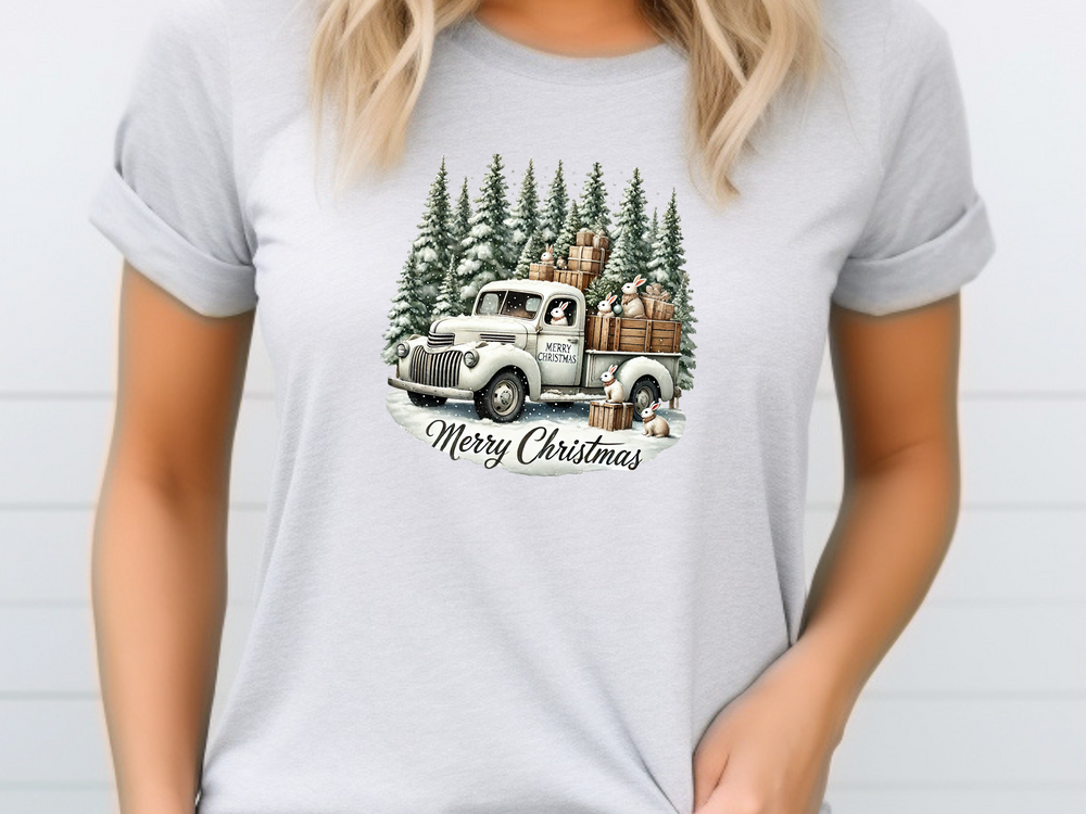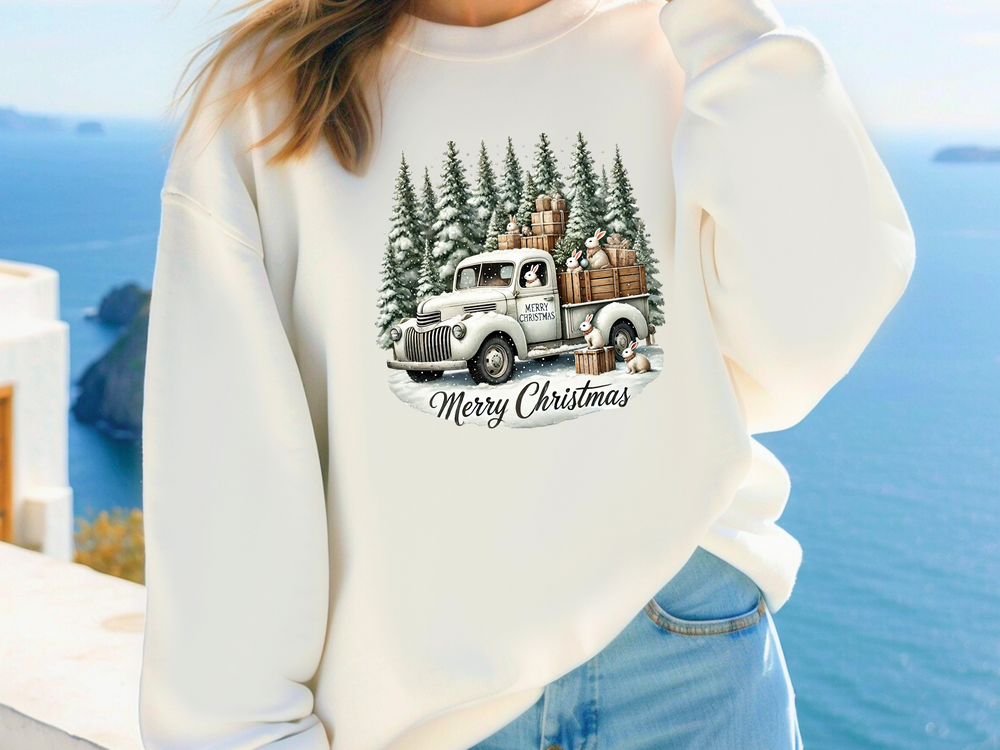 The Rustic Christmas Truck DTF Transfer showcases a charming winter scene featuring white bunnies and a cozy bench, perfect for holiday-themed apparel. This ready-to-press Direct To Film transfer is ideal for festive DIY projects and Christmas T-shirts.