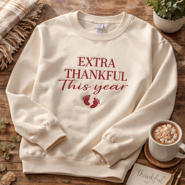 Celebrate gratitude and new beginnings with this “Extra Thankful This Year” baby footprints embroidery design, perfect for Thanksgiving season. Thoughtful and heartfelt, this embroidered piece makes a beautiful baby announcement, keepsake, or meaningful fall gift.