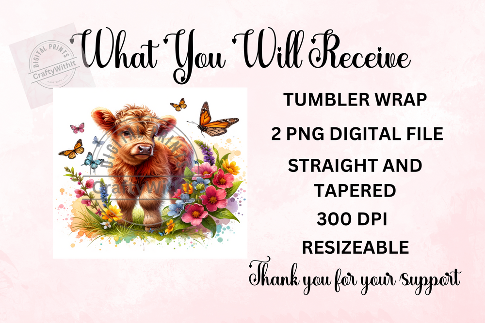 Explore a delightful Highland Cow spring-themed 3D design perfect for 20oz skinny tumblers. This sublimation design is available as a digital download, featuring a PNG format suitable for straight tumbler wraps. The design includes charming butterflies, adding a whimsical touch to your tumbler creations.