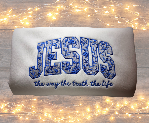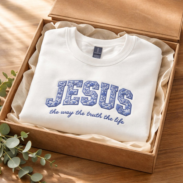 Celebrate your faith with this cozy embroidered sweater featuring “Jesus the Way, the Truth, the Life.” A perfect Christian gift or everyday reminder of your spiritual journey in a stylish and warm design.