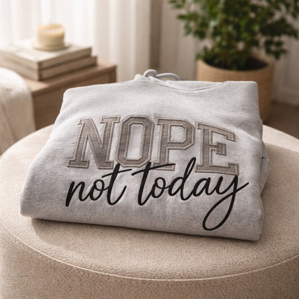 Stay cozy and stylish with this "Nope, Not Today" embroidered sweatshirt! Perfect for self-care days, this comfy crewneck makes a great gift for her, whether for a teen girl, birthday, or just because. Featuring high-quality embroidery, this sweater is a fun and trendy way to express your mood while staying warm and comfortable.